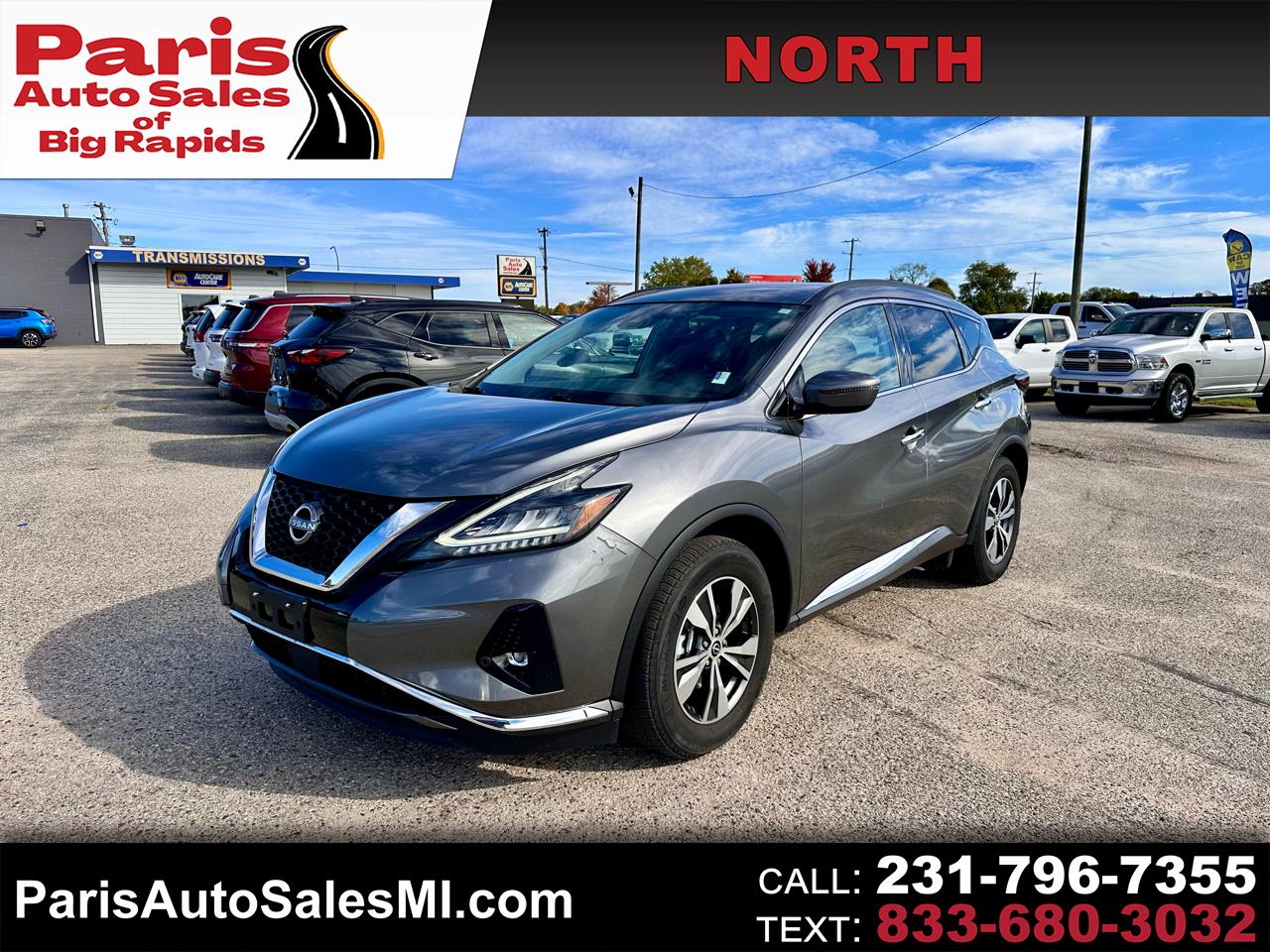 Check out this 2023 Nissan Murano SV AWD in Gun Metallic at Paris Auto Sales in Big Rapids, MI. We’re your trusted used SUV center of Big Rapids, and we’ll help you find the right balance of comfort and capability. Call 231-796-7355 (North Lot) or 231-598-9184 (South Lot) to schedule your test drive.